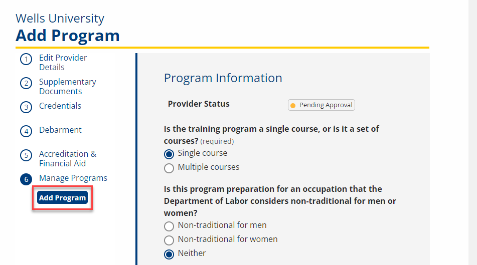 | Total Number of Training Weeks | (Text) Enter the number of weeks needed to complete the program / course. |