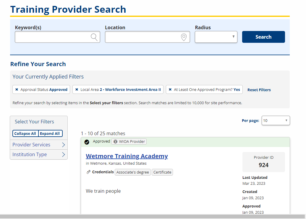 - The Training Provider Search page displays. Complete the fields relevant to your search.