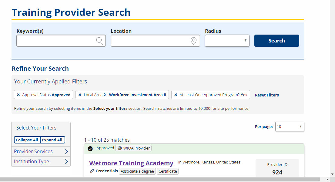 Training Provider Search Field Description Keyword(s) (Text) Enter any keywords relevant to your search or leave blank to return all results based on location. Location (Text) Select a city area location or specific city. Radius (Drop-down) Select a radius from the drop-down. The search will include providers within this distance from the location. Search (Button) Click to execute the search using the selected parameters and filters. FILTERS (can be selected from the Select Your Filters box. Applied filters appear under Your Currently Applied Filters) Provider Services Select a type of Provider Service to limit search results to providers of that type. Institution Type Select the Institution Type. Options are: - Higher Ed: Associate’s Degree