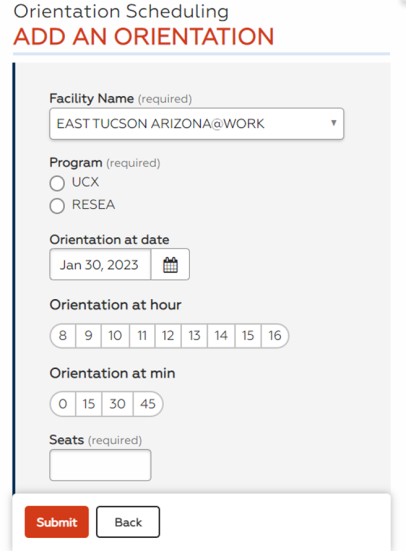 - Click Submit. The new orientation session is added. You may also click Back to discard the new orientation and return to the Orientation Scheduling page