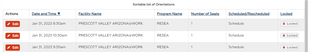 - Use the dropdown menus and sortable columns to identify the unlocked orientation session you wish to remove. Click Edit.