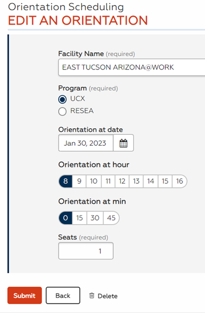 - Modify as needed and click Submit. You may also click Back to discard your changes and return to the Orientation Scheduling page.