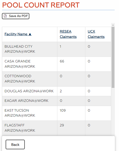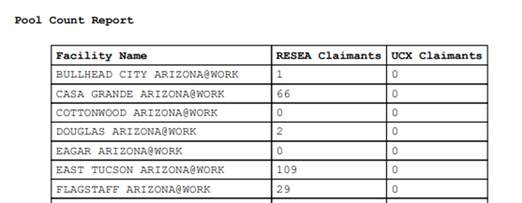 Administrators and supervisors can view or print a Pool Count Report. The report displays the number of claimants in the profiling pool who are waiting to be scheduled for an orientation by program and office.