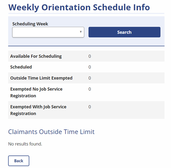 Administrators can view the weekly orientation schedule for a specific scheduling week, and a list of claimants outside time limits.
