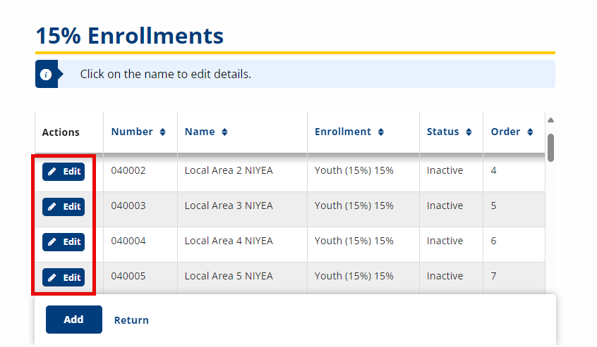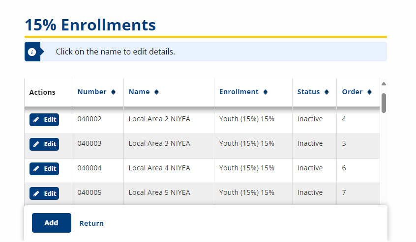 Approved staff can view programs funded with the Statewide 15% Set Aside funds and edit or add programs.