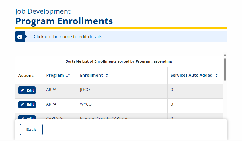 - Click the Edit link next to the program enrollment affected. The list of program-specific services displays.