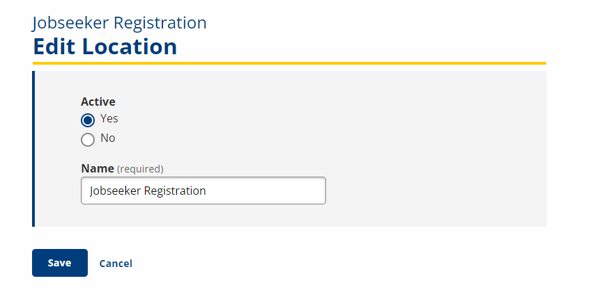 - Activate or deactivate the location by selecting Yes or No in the Active box. Do not edit the location Name.