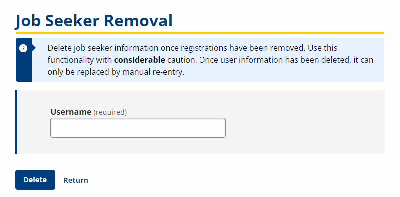 Approved staff can delete a job seeker account from AJL. This function should be used with considerable caution. Once the information is deleted, it can only be replaced by manual re-entry.