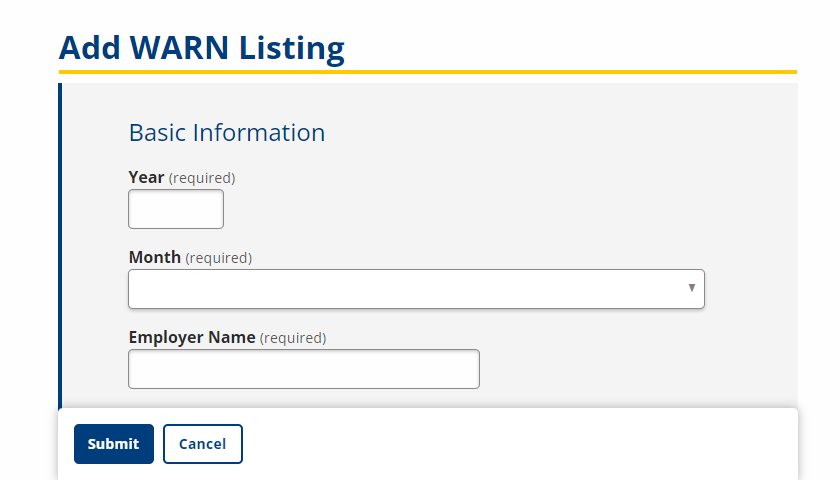 - Notice Type: Option; Select the type of layoff: WARN or Non-WARN.