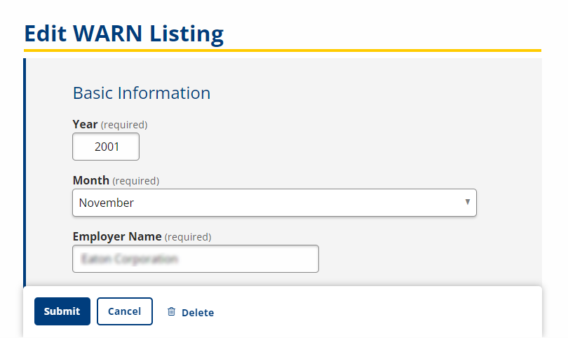 - Click a link in the Employer column to view details of the layoff. The Edit WARN Listing page displays.