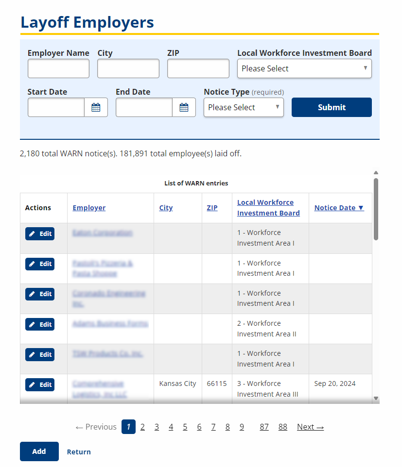 - End Date: Text/Calendar; Type an end date in the mm/dd/yyyy format to search by date. Entering an end date without start date displays layoffs prior to the End Date. Entering a Start Date and an End Date displays layoffs within the specified time period.