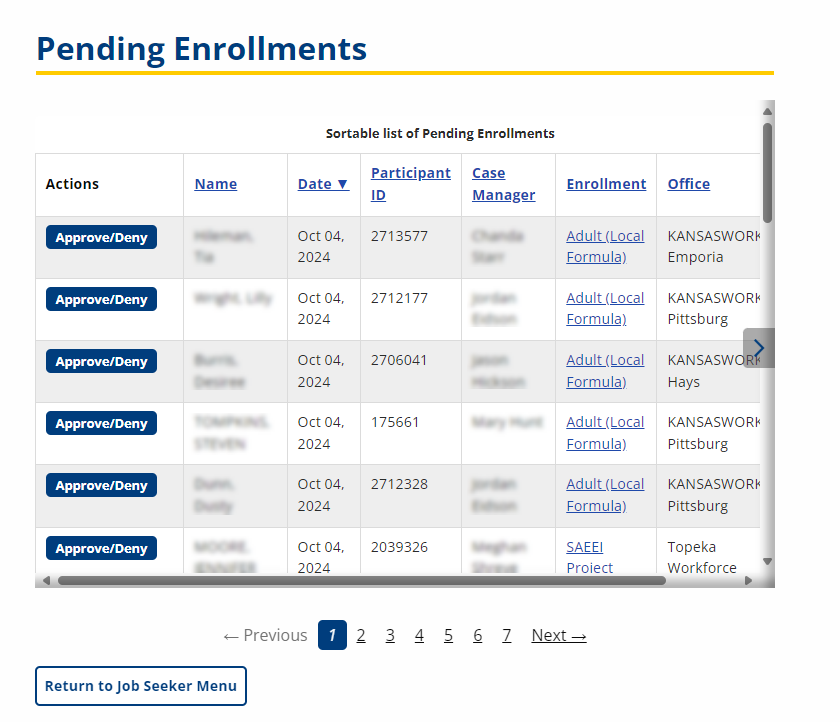 - Identify the job seeker for whom you need to approve an enrollment (you can sort the list by column heads).