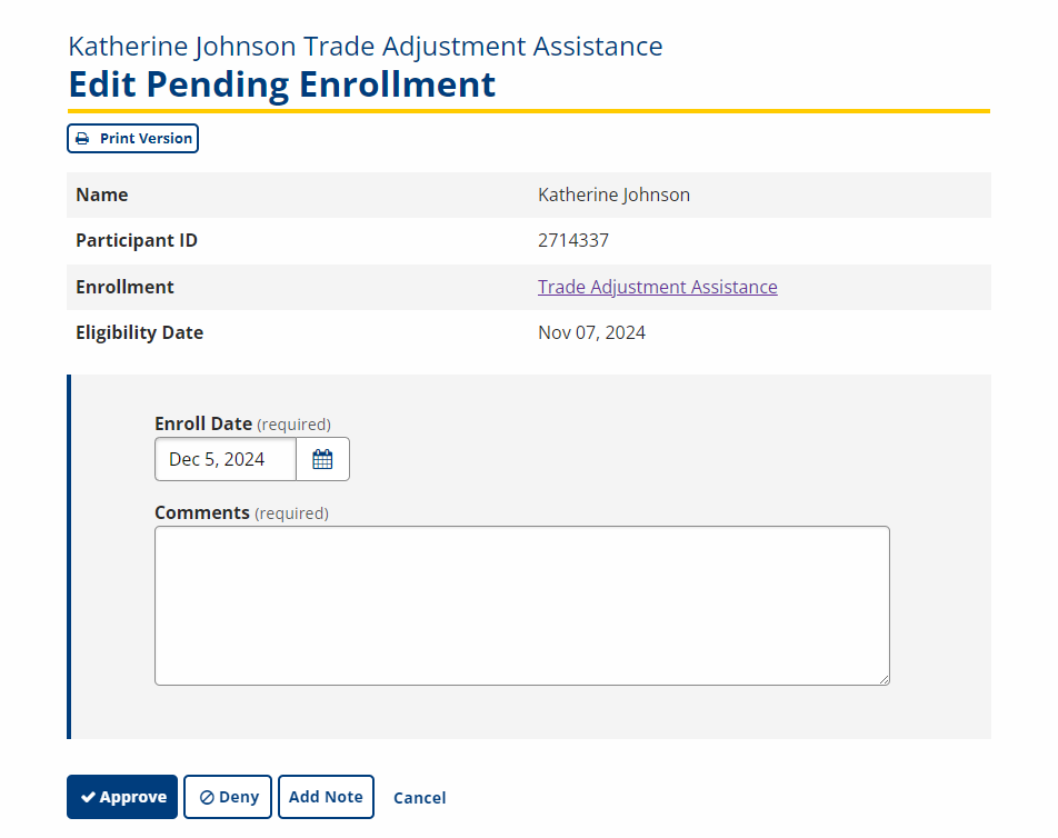 - Click Approve to finalize the enrollment approval or click Deny to deny the enrollment for the job seeker.