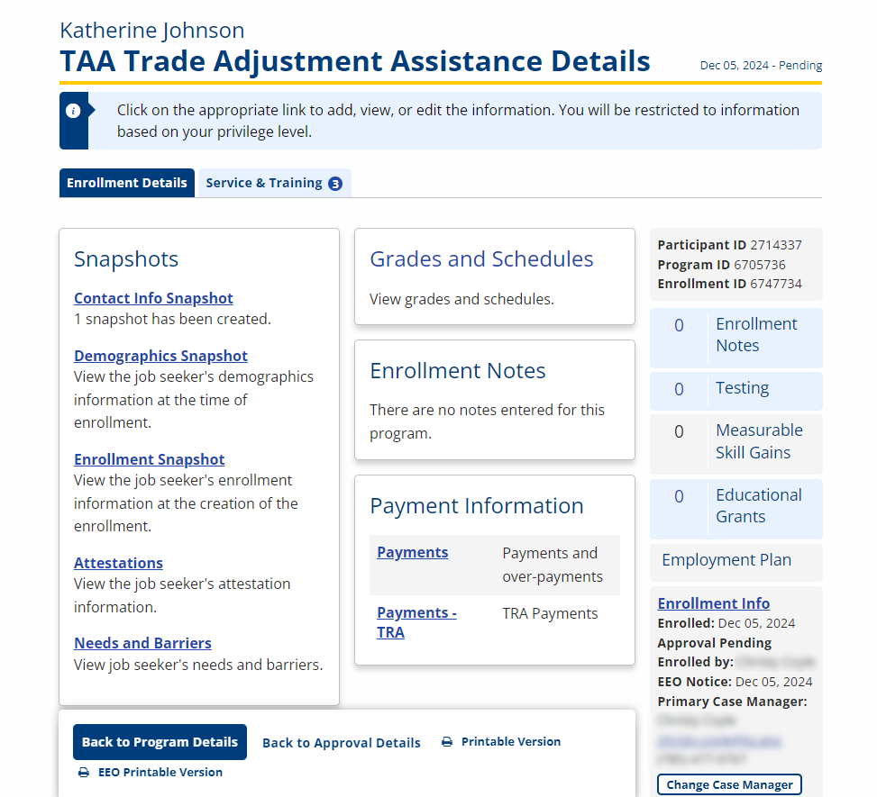 - In the Enrollment Details tab, review the job seeker's demographics snapshot.