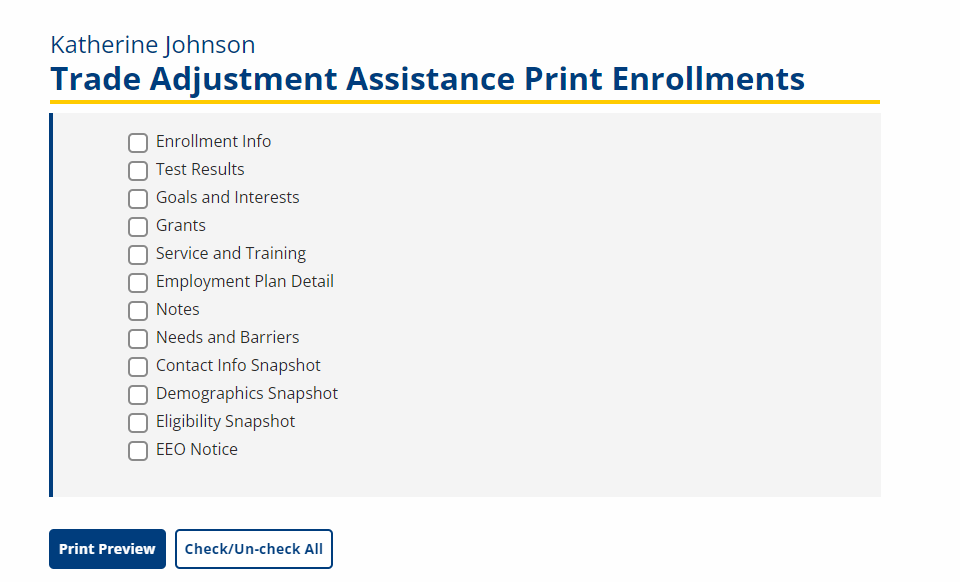 - Click Printable Version. The Print Enrollments page displays. Select any areas of the enrollment to print. The Job seeker Status Sheet with selected enrollment information displays for print with signature blocks. To return to Pending Enrollment, use the browser back button.