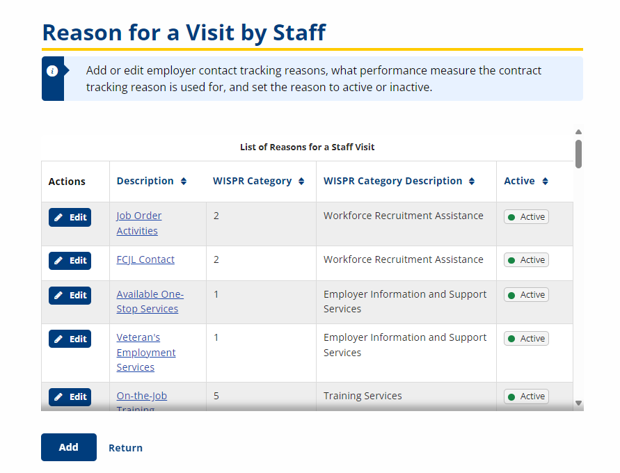 Approved staff can add, edit, and disable the values displayed in the Reason for a Visit by Staff drop-down that appears on the Employer Contact Details page.