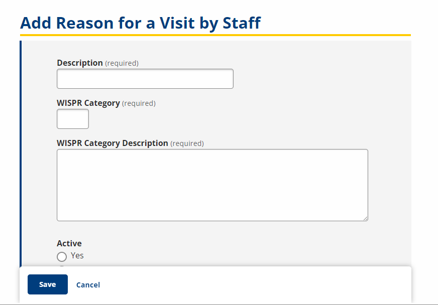 - Active: Option; To actively display the reason in the drop-down, select Yes. Inactive reasons do not display to staff in the drop-down, but do display on the Staff Visit Reasons page (if Show All is selected), where they can be activated at any time.