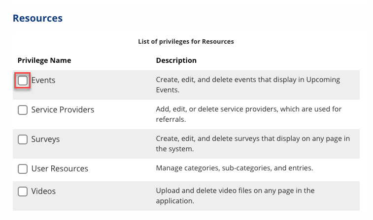 Scroll down to the Resources section, then check Events (along with any other privileges needed for the user). Click Save.