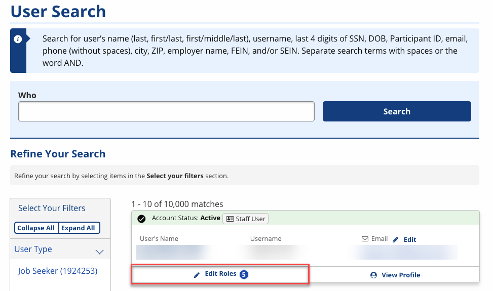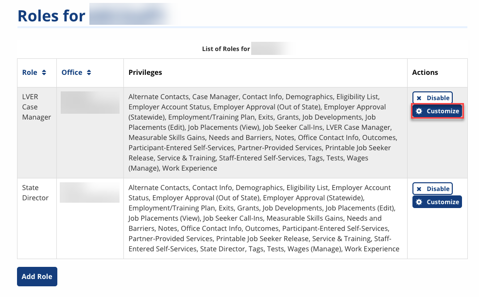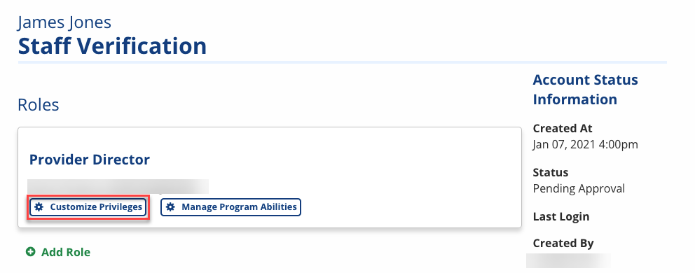 In the Staff Verification page, find the user's role in the Roles section and click Customize Privileges. The Customize Privileges page displays.