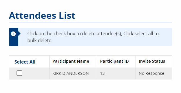 To delete an attendee, check the box next to the attendee you want to delete (or click Select All to select all attendees), then click Delete Selected Attendee(s). Click Continue in the confirmation dialog.