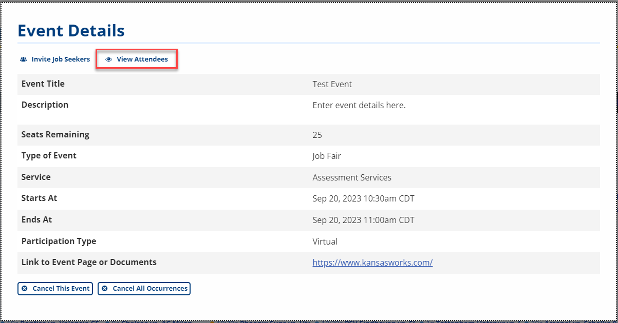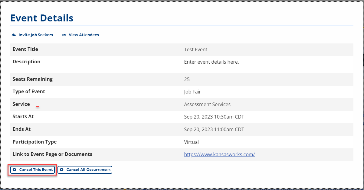- Service: (Optional) If this Virtual Job Fair is related to a specific service, you may search for and select it in this field. When a job seeker registers for this event, this service will populate on their Service & Training list for their program enrollment, if applicable. Only active services are available to select.
