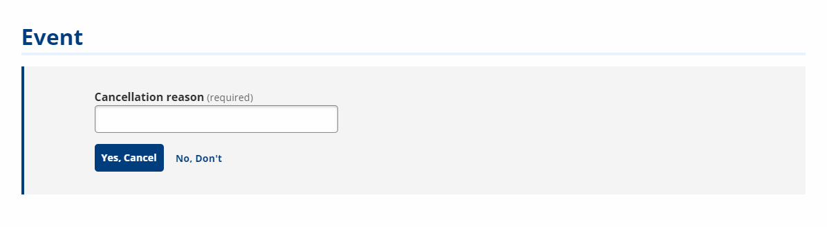 In the Event dialog that displays, enter a Cancellation reason, then click Yes, Cancel to cancel the event. To close the Event dialog without canceling, click No, Don't.
