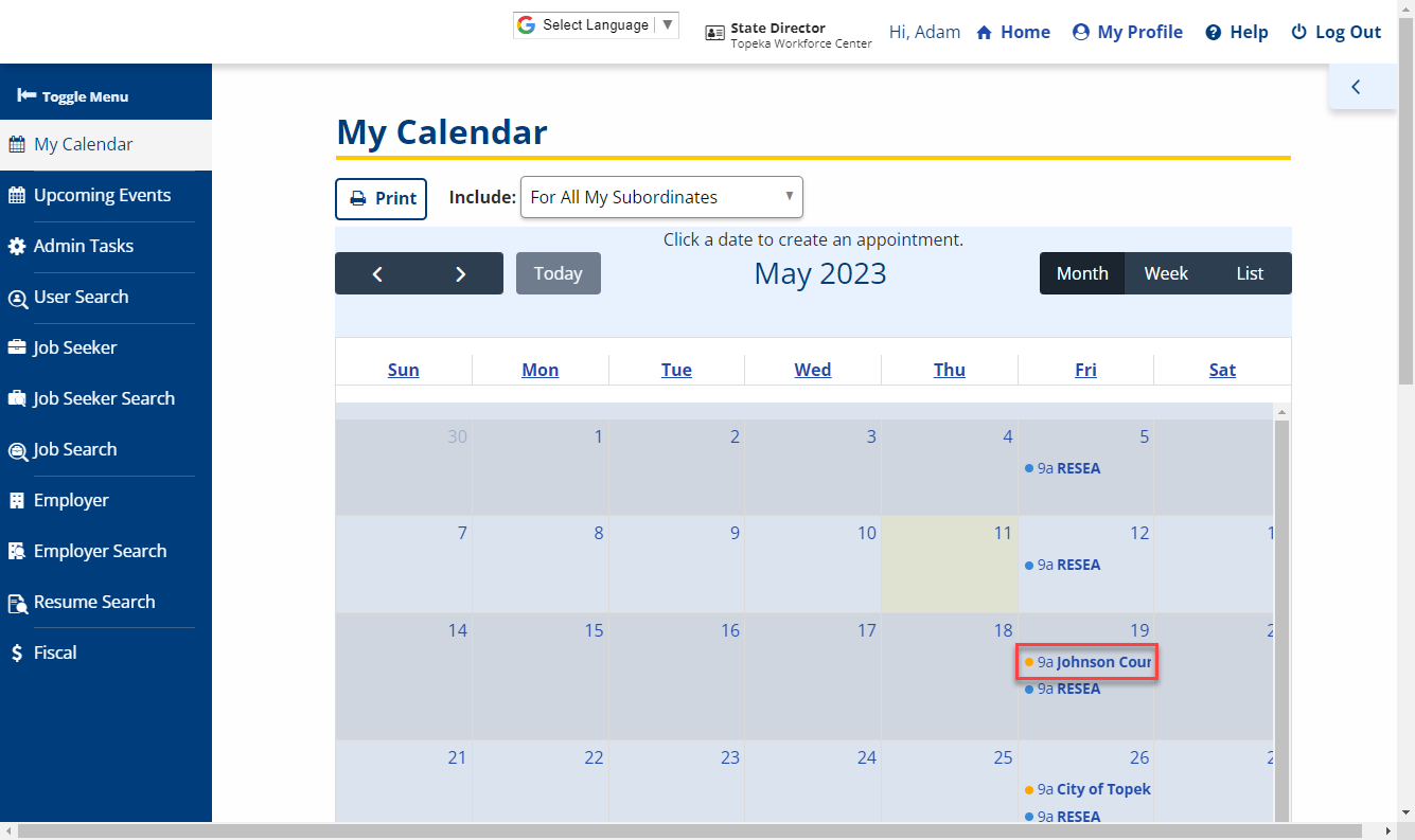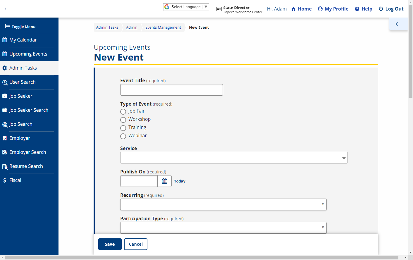 Approved staff can enter event details for upcoming job fairs, workshops, and trainings.