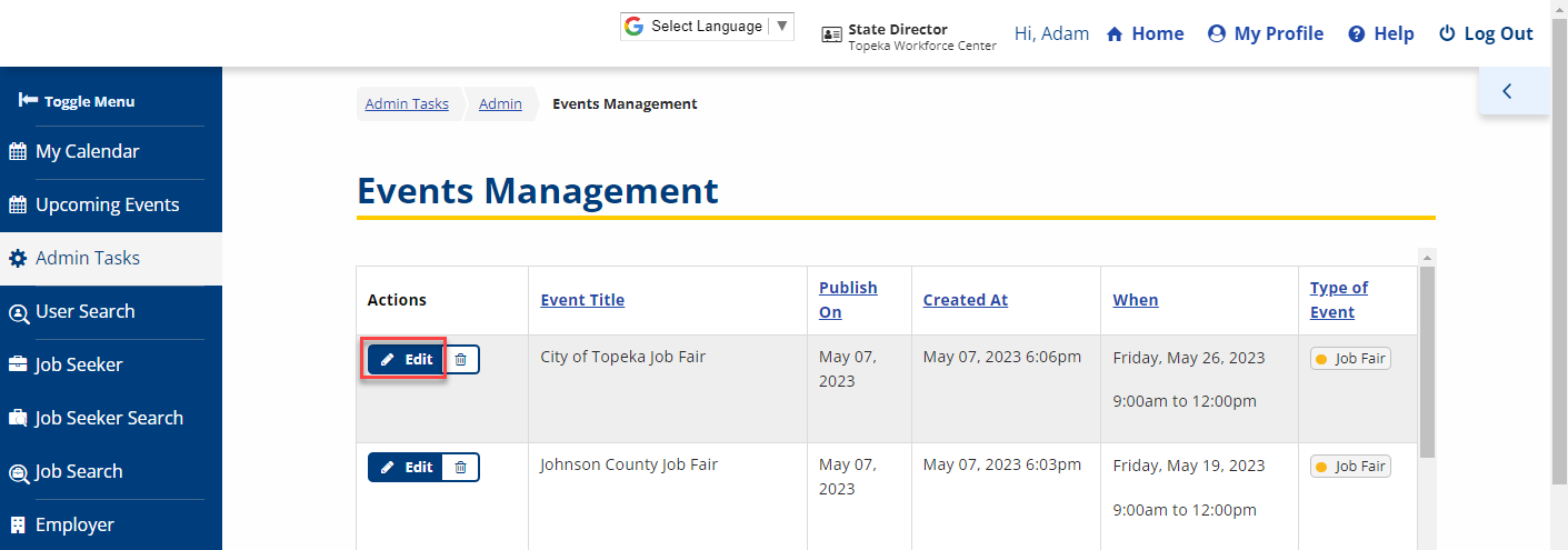 - On the Events Management page, click the Edit button of the event you want to manage. The Edit Event page displays.