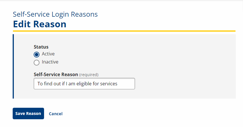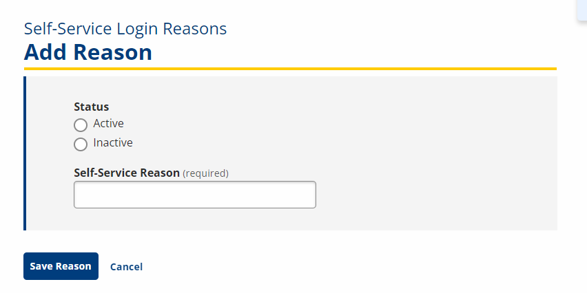 - Click Save Reason. The new reasons appears on the Self-Service Login Reasons page.