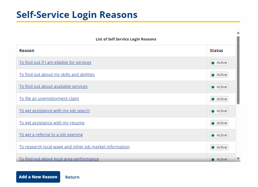 The Self-Service Login Reasons editor in Admin provides functions to manage the self-service questions (a.k.a. “What Are You Doing Today?”) displayed to self-service job seekers when they log into JobLink. If you do not wish any questions to display, set existing questions to Inactive.