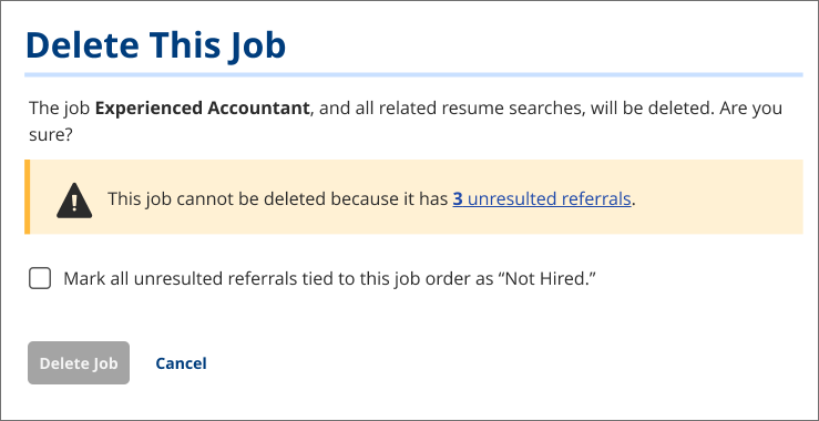 If you attempt to delete a job that has one or more referrals with no results, the following message displays in the confirmation dialog and the Delete Job button is disabled.