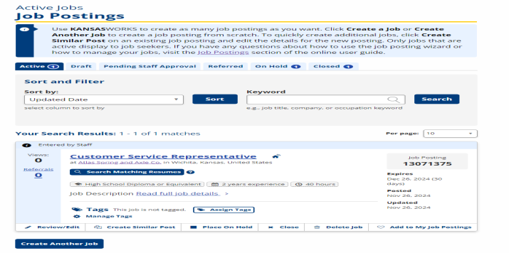 Place on Hold: When staff make referrals, they have the option to place the job posting on hold while waiting for an outcome to the referral. Job postings that have met the employer's required number of referrals automatically go on hold. While the job posting is on hold, additional job seekers cannot be referred to the posting.