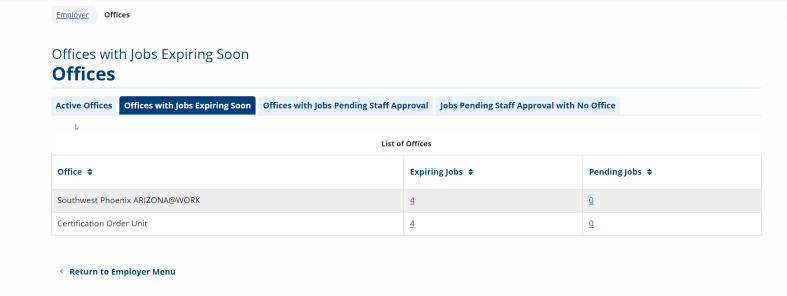 - The Offices page displays with the Offices with Jobs Expiring Soon tab. The list is sorted by the number of expiring jobs by default. You may also select a different tab if needed: