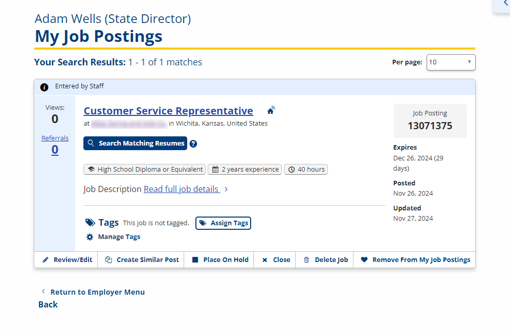 - Create Similar Post: Click to create another job posting with similar criteria to the existing posting.