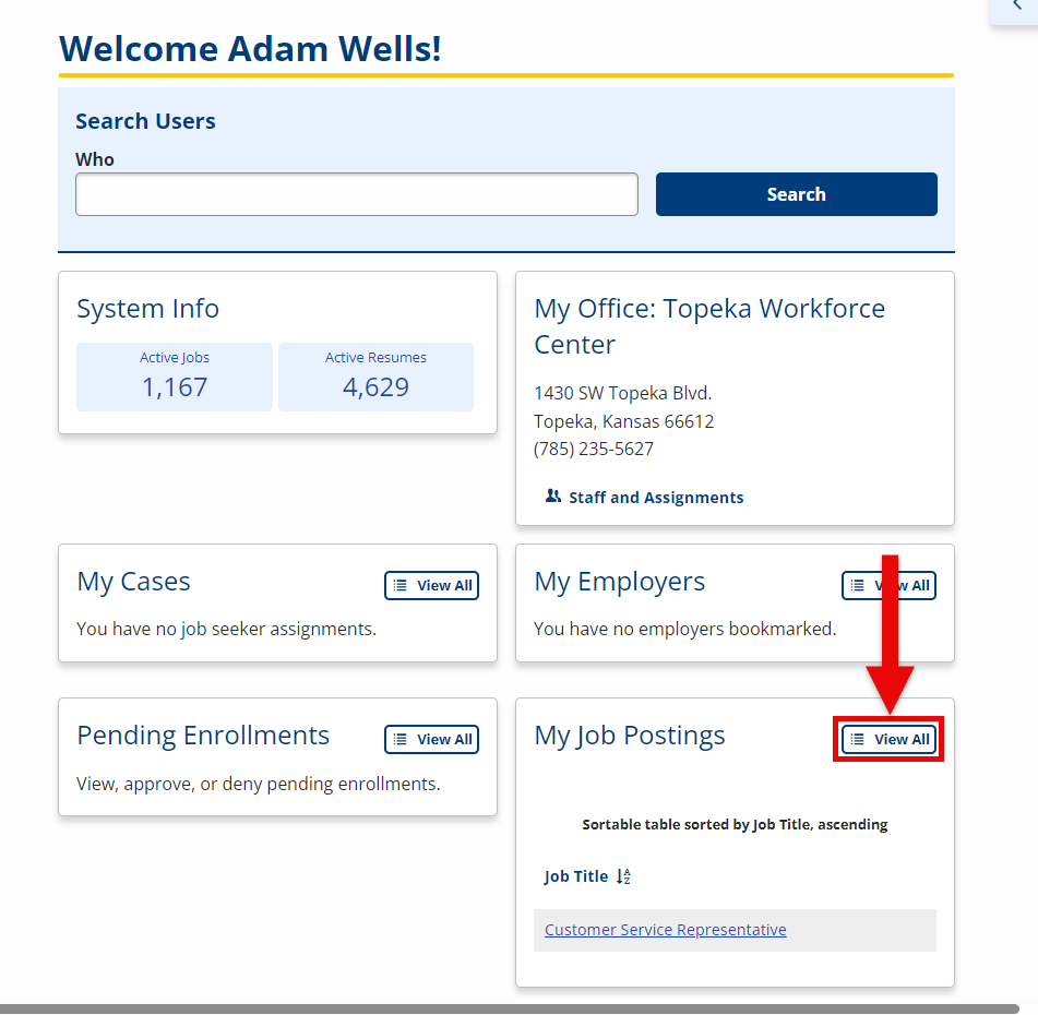 Staff: From the homepage, click View All in the My Job Postings tile.