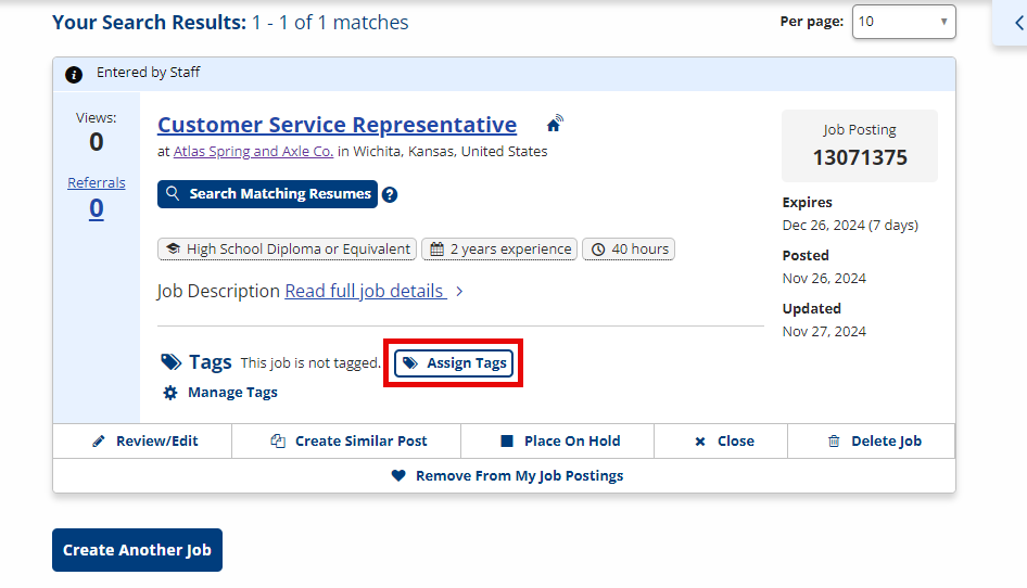 - Navigate to an employer's job list. Next to the desired job posting, click Assign Tags.