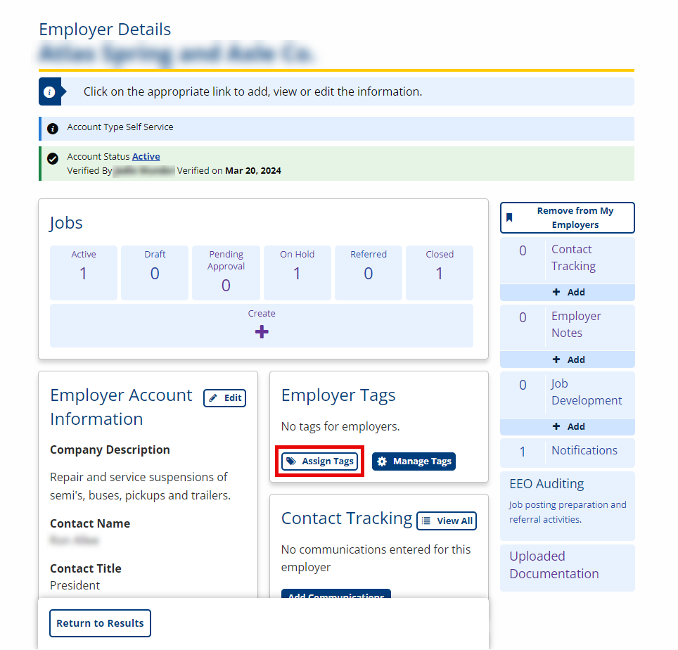 Employers can tag their company by navigating to their Employer Details page and clicking Assign Tags in the Employer Tags tile.