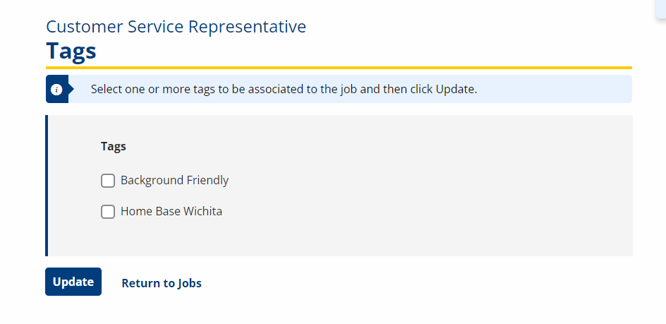 - The Tags page displays. Check the box for the tag(s) you want to apply and uncheck the box for the tag(s) you want to remove from this job posting.