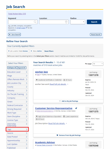 - On the Job Search page in the Select Your Filters menu, click Tags.