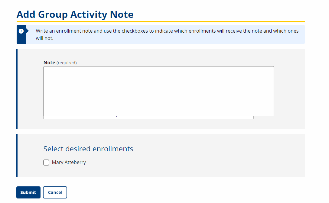 To add an enrollment note for the job seekers signed up for an activity, click the link in the Enrollments column. The Add Group Activity Note page displays.