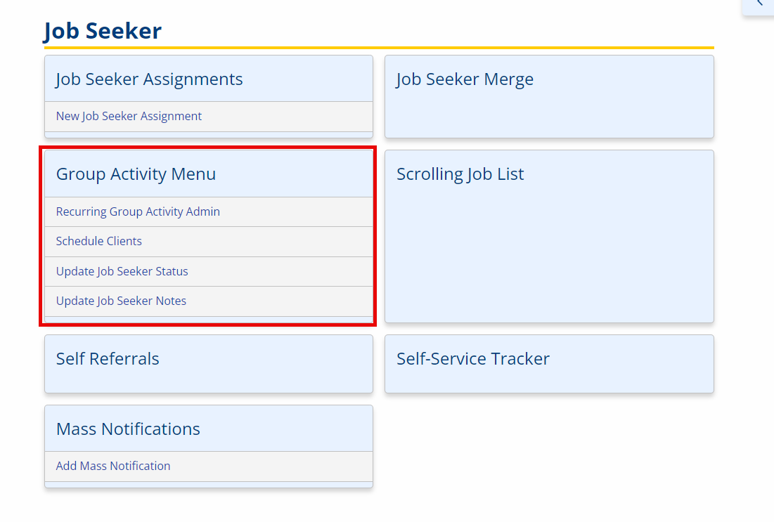 From the left-hand navigation menu, navigate to Job Seeker, then select the Group Activity Menu tile.