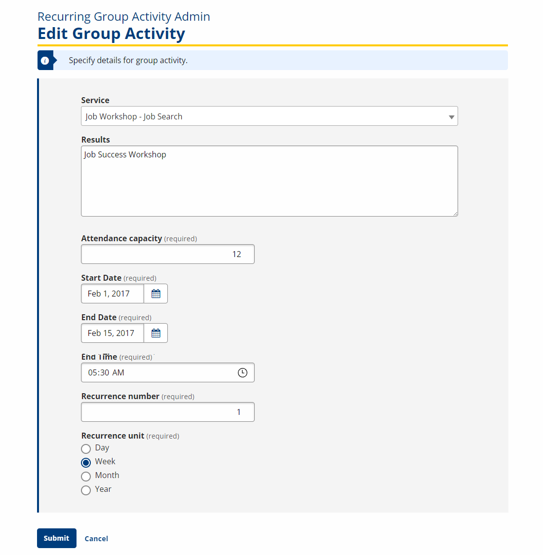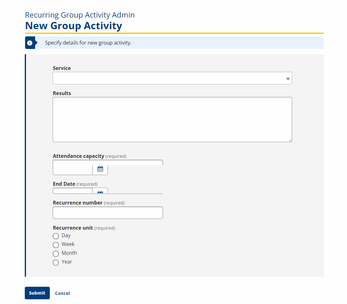 - Click a link in the Service column to edit a recurring group activity. The Group Activity page displays with the information for the activity. Make changes as needed and click Submit to save changes or Cancel to return without saving changes.