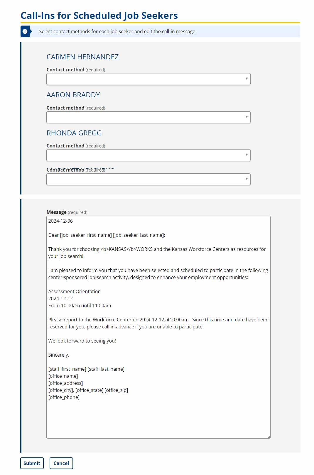 - If call-ins were selected for any job seekers, the Call-Ins for Scheduled Job Seekers page displays. Select the contact methods for each job seeker and edit the call-in message as needed. Click Submit.