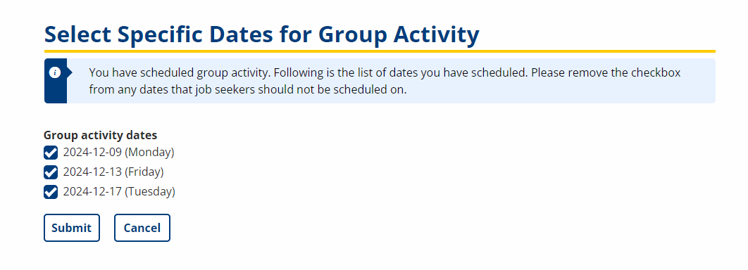 - Each date has a checkbox and all checkboxes are defaulted to be checked. Review the dates carefully. Uncheck any dates on which the activity will not occur (e.g., holidays). Click Submit to save the information and add the activity. Click Cancel to return without saving any information. The activity is not added.