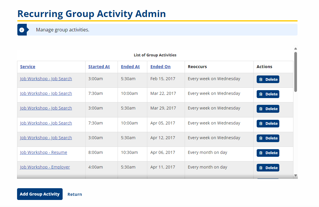- Click the Delete button in the Actions column to delete a group activity. A confirmation page displays to confirm the deletion. Click the Delete button to delete or the Cancel button to return without deleting. Group Activities cannot be edited or deleted if job seekers are scheduled.