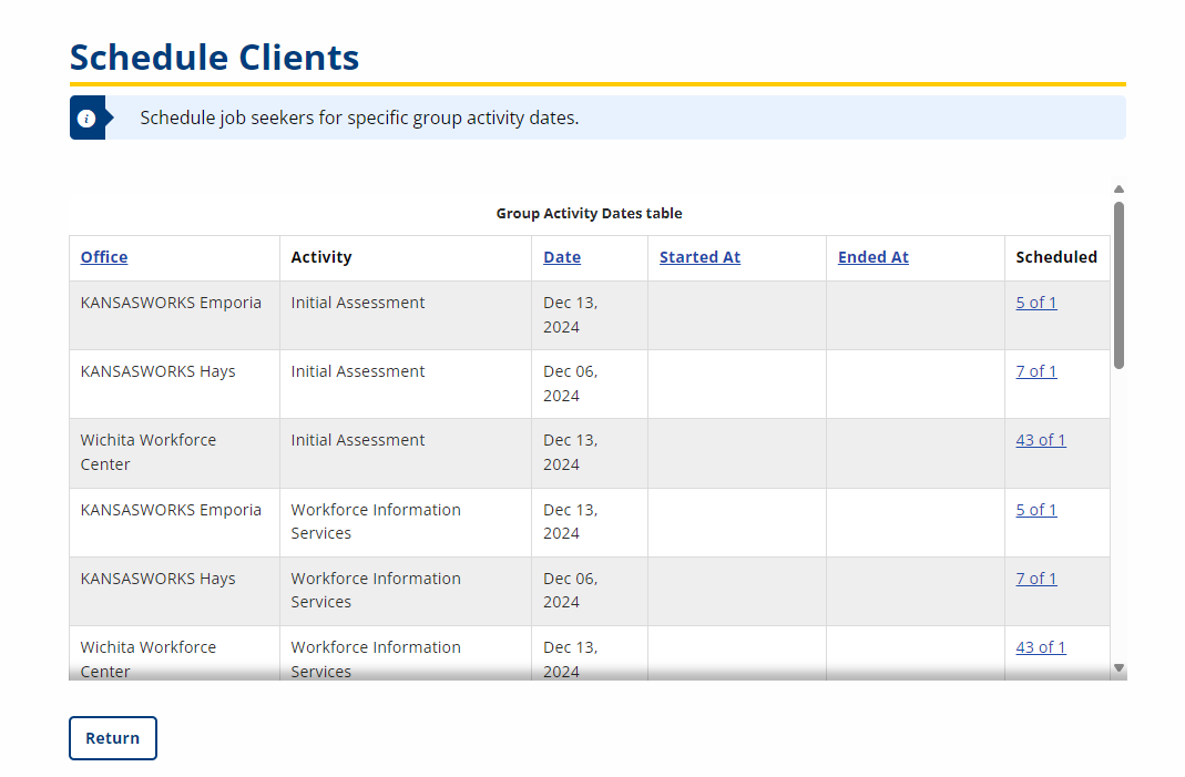 - Navigate to Job Seeker > Group Activity > Schedule Clients. The Schedule Clients page displays. The page displays activities scheduled by the user's office.