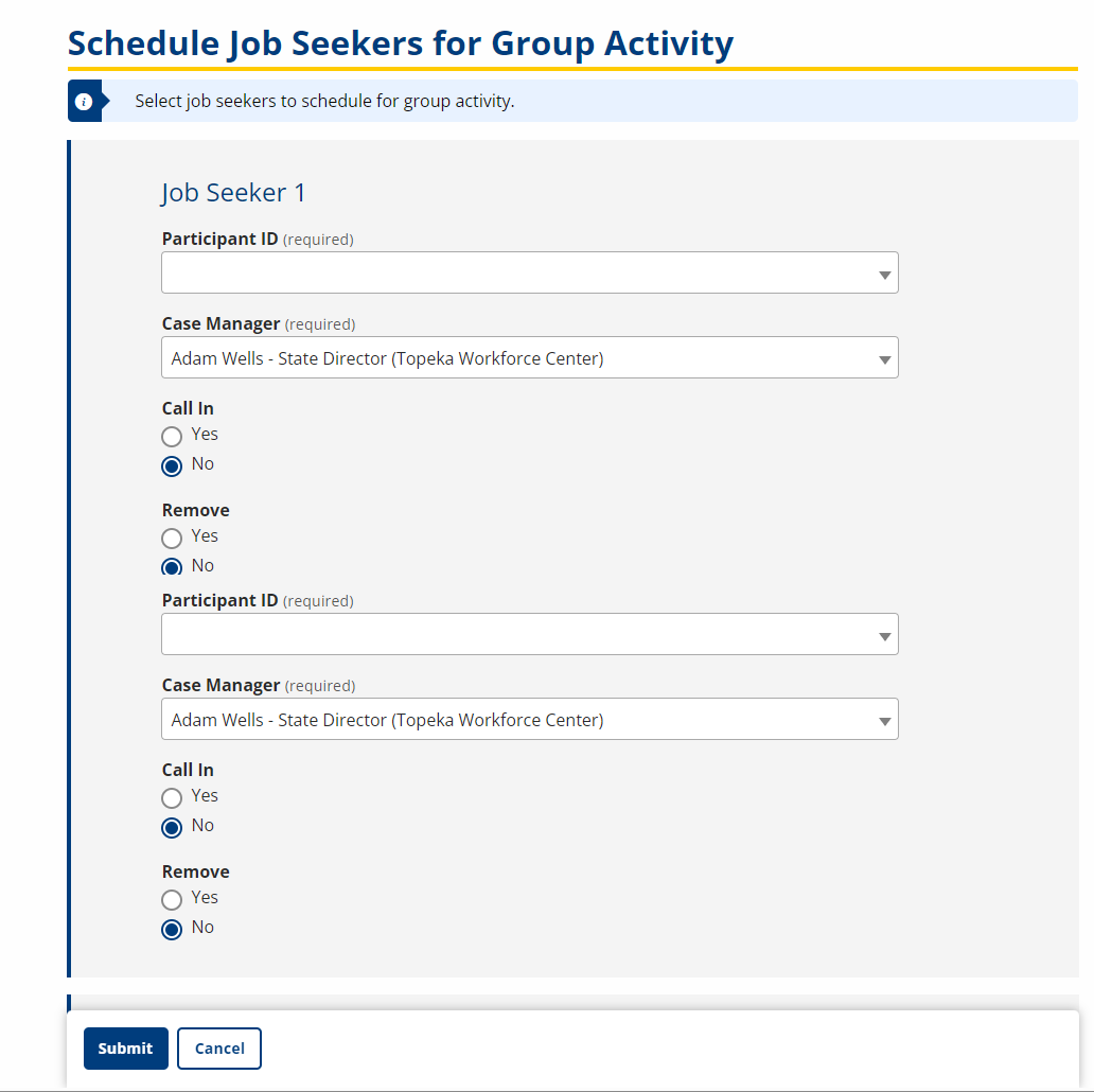 - Call In? Select Yes or No. See the Job Seeker Call-Ins topic for instructions for Job Seeker Call-In.