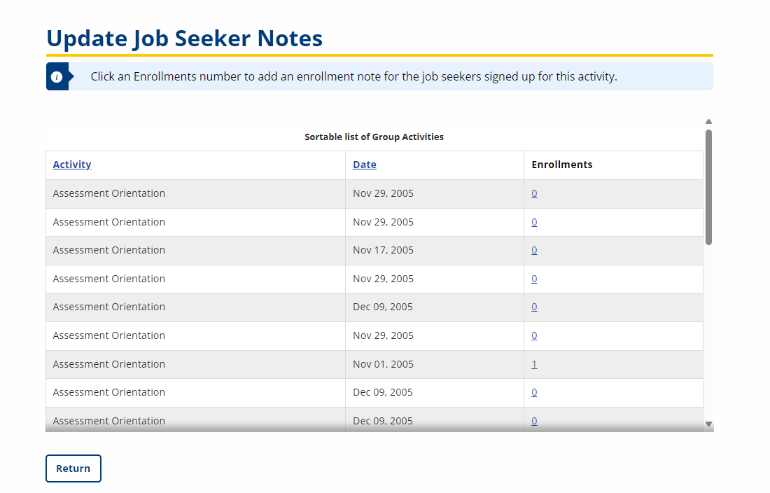 A group activity is a service. When job seekers are scheduled for a group activity, the activity (service) is added to the job seeker's Service and Training Plan as a scheduled service, if the job seeker has the appropriate open enrollment. Job Seekers who do not have an appropriate enrollment can be scheduled, but the enrollment and service must be entered manually.