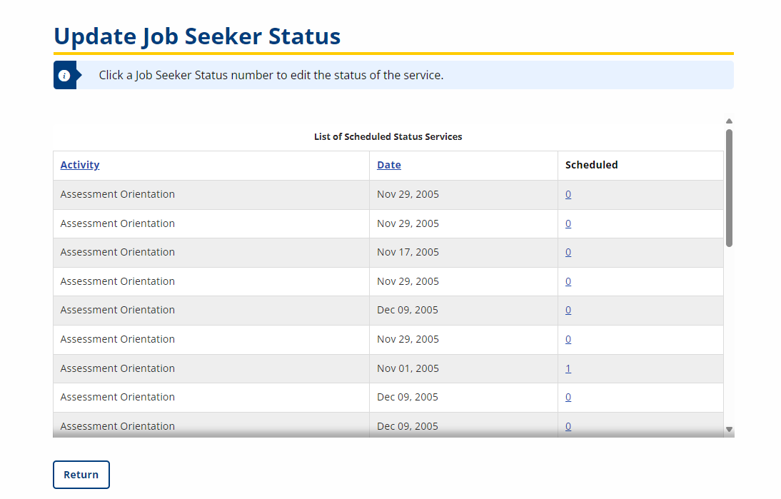 - Update Job Seeker Status: Displays the Scheduled Status Services: list of group activities with job seekers whose service status has not yet been updated. The activities continue to display until all job seekers are updated.