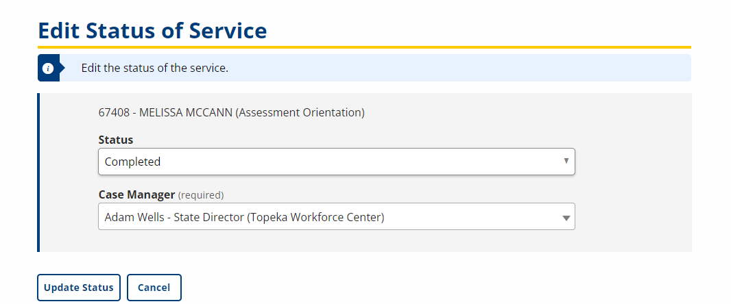- The Status drop-down defaults to Scheduled, which is the current status of the service. The Case Manager defaults to the case manager who scheduled the job seeker, but is editable.